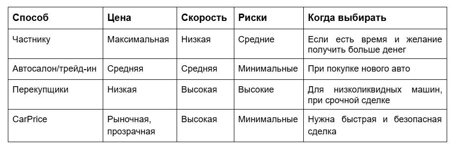 Единственно верного способа продажи машины не существует. Все зависит от состояния автомобиля и того, насколько срочно нужны деньги. Оптимальный баланс между ценой, безопасностью и удобством — это сервис CarPrice. На сделку с частником уходит много времени, в автосалоне продавец ограничен в условиях и вынужден платить комиссию, а перекупы не дают юридических гарантий и сильно занижают цену.